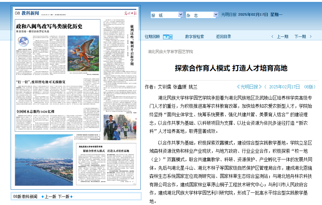 以合作共享为基础,积极探索双赢模式,建设综合型实践教学基地。学院立足区域森林资源优势和林业产业现状,与地方政府、行业企业合作,积极探索“校—地(企)”双赢模式,联合共建集教学、科研、资源保护、产业孵化于一体的发展共同体。先后与湖北星斗山、湖北木林子等国家级自然保护区管理局合作,建成湖北恩施森林生态系统国家定位观测研究站、国家林草生态综合监测站;与湖北旭舟林农科技有限公司合作,建成国家林业草原山桐子工程技术研究中心;与利川市人民政府合作,建成36365线路检测登录入口林学园艺利川研究院,形成了一批高水平综合型实践教学基地。