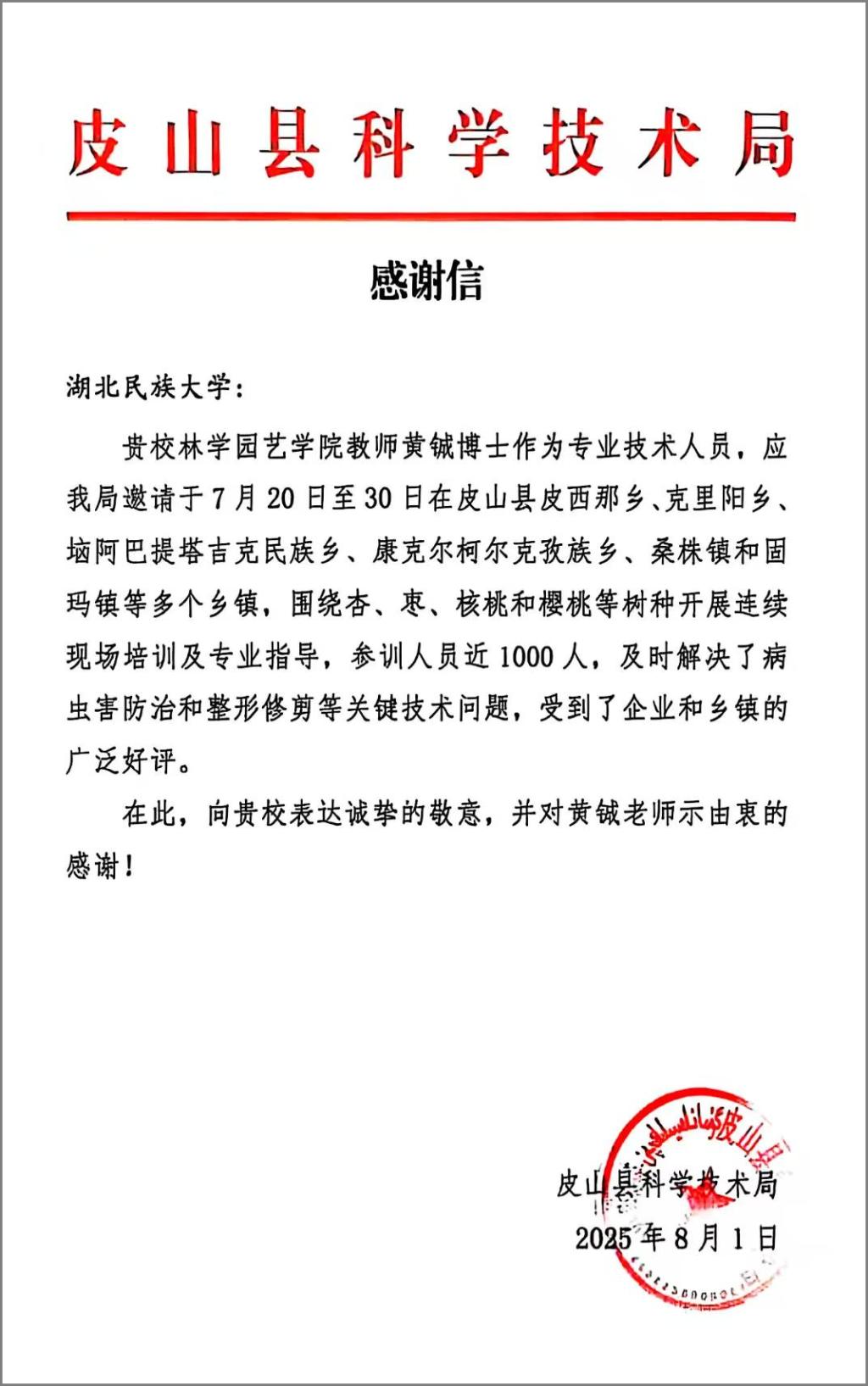 培训结束后,皮山县科技局专门寄来感谢信,对黄铖老师的辛勤付出和36365官网的大力支持表示高度赞赏和诚挚感谢。信中特别提到,此次培训内容实用、组织有序,切实解决了林农在生产中遇到的技术难题,体现了高校服务社会的责任与担当。(通讯员:余慈爱,编辑:黄铖,审核:胡海剑)