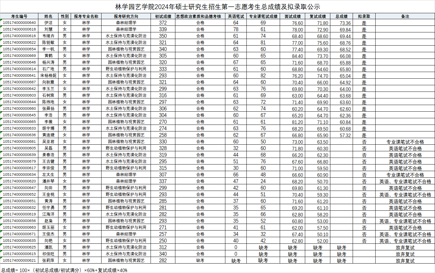 林学园艺学院2024年硕士研究生招生第一志愿考生总成绩及拟录取公示