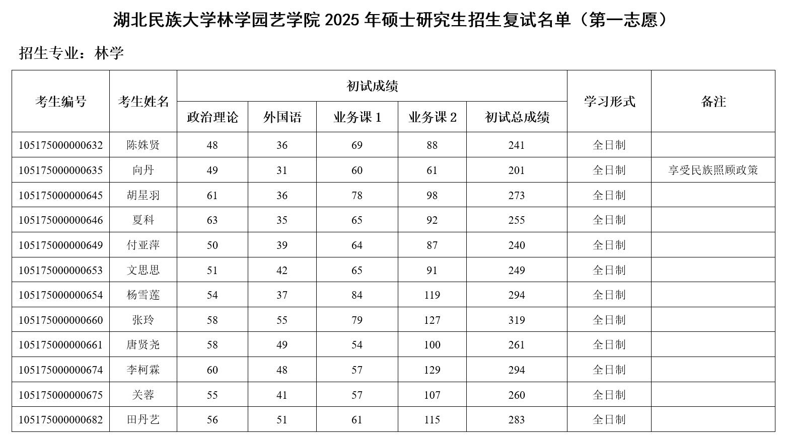 林学园艺学院2025年硕士研究生复试名单(第一志愿)