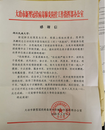 本网讯(通讯员 雷文欣 廖雅芳 谷祥裕/文)“沧海横流,方显英雄本色”3月7日,我院收到一封来自大冶市肺炎疫情防控工作指挥部办公室的感谢信,来信对我院学子卫涛在疫情中舍小家、为大家做出的贡献表达了感谢。