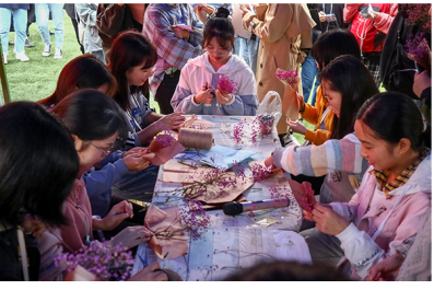 “这个好神奇,居然可以把这花花草草的形状印在布上”、“这个干花束好好看啊”、“唉,差点就套中了”花木盆景协会的活动在一片惊叹声中热闹起来。此次活动包括“秋叶留春”、“不负花期”、“花源紧簇”以及“植物拓印”四个小活动。“秋叶留春”制作植物便签,“花源锦簇”进行干花搭配,“植物拓印”将植物留在布上等。参与者只需参与其中任意两个活动,并凭借个人活动作品即可获得花木盆景协会的印章。 花木盆景协会在该活动中负责提供各类花、叶以及用具,工作人员在旁指导参与者自由创作。