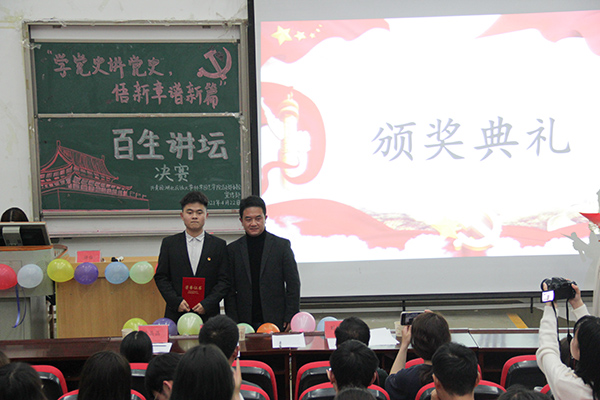 本网讯(通讯员王思雨 孙浩天 于耀波/文 姜依维 周欣岳/图)4月22日晚,为庆祝中国共产党成立一百年,进一步贯彻落实团中央相关工作部署,我院团总支联合学生会宣传部在修远楼5B403教室举办“学党史讲党史,悟初心谱新篇”百生讲坛。我院党总支副书记赖申昊,团总支书记刘桃元,学生科辅导员黄晶晶受邀出席并担任评委。