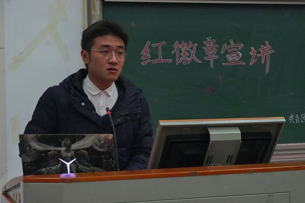 本网讯(见习通讯员 黄海娇 姚佳瑞 刘荣/文 关蓉/图 )11月26日晚,我院在修远楼5B403教室开展“向建党一百周年献礼,争做新时代的‘张富清’”红徽章宣讲活动。本次活动旨在让我院团学干部了解学习张富清不惧困难,甘于奉献,坚守初心的优秀品质,由红徽章项目组成员张祖鑫进行授课,全体团学干部到场。