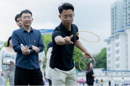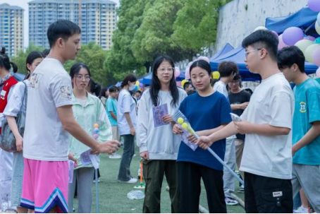 手写“畲”字环节,学生用毛笔在纸上书写隶书和楷书“畲”字,感受中华汉字演变的魅力;竹竿舞环节,学生在体验艺术中,培养团队默契;采柿子环节,用乒乓球和塑料瓶模拟采柿子,体验畲族的特色民族文化;套圈游戏环节,参与者手持不同大小的塑料圈,站在红线外,向物品区域抛掷圆环,套中即可获得奖品。丰富多彩的奖品和紧张刺激的游戏方式吸引大批学生参与游戏,期间不断发出套中奖品的欢呼声。