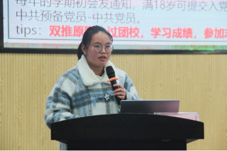 刘梦迪以要树立坚定的信念,培养综合能力,作出清晰的职业规划为内容展开分享,鼓励同学们多参加各种志愿服务和创新大赛,锻炼综合素质能力,提升自我价值。