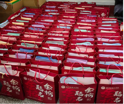 这份“加油包”满载着祝福:大红色的手提袋上印着金色的“金榜题名”、逢考必过明信片、寓意运旺时盛的旺仔牛奶以及“橙”功上岸的脐橙,还有“暖身更暖心”的暖贴,水逆退散口罩和考试必备文具袋。