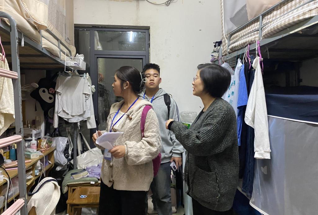 在排查过程中,赵书记提醒同学们要及时排查和整改各类安全隐患,落实安全措施。同时,他强调要不断提高寝室环境卫生意识的重要性,并鼓励大家养成良好的卫生习惯,共同营造温馨舒适的寝室氛围。除此之外,赵书记还详细询问同学们的生活近况和需求,并一一解答同学们在生活、学习以及未来职业规划发展道路方面的困惑。为此,赵书记还对同学们的学习规划与未来发展方向提出了殷切希冀和宝贵建议。