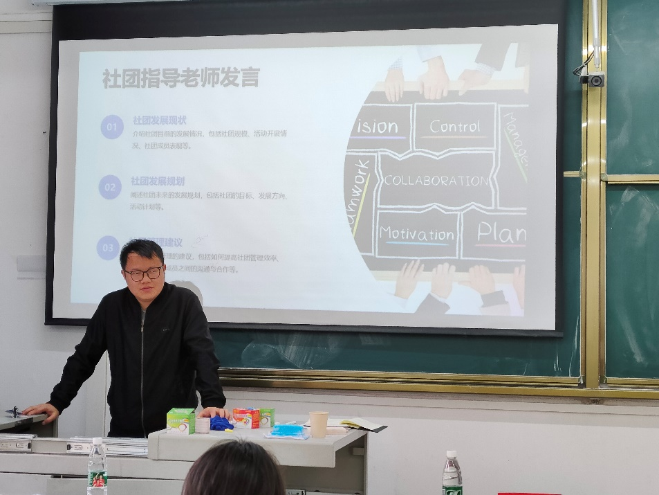 赵老师讲解了数学统计建模社团发展现状、发展规划,提出社团管理相关意见和建议。他对社团规模、活动开展情况、社团成员表现等进行分析,并阐述社团的目标、发展方向、活动计划等。赵老师还对社团管理效率的提高以及社团成员之间沟通合作的加强等提出了宝贵建议。鼓励社团干部要积极引导干事参加各类竞赛,提高并丰富社团的创新能力和参赛经验,培养干部干事的竞赛能力。