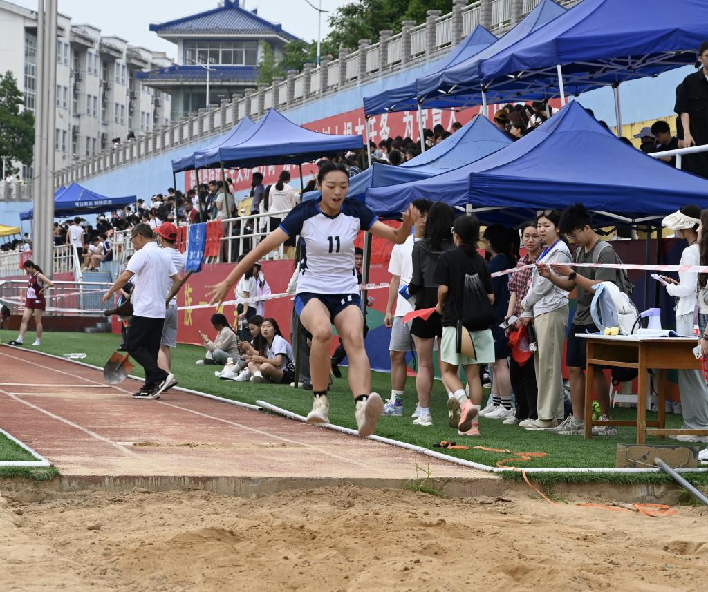 我院覃梦妮娜同学荣获跳远第二名。在跳远的瞬间,她全身的力量都集中在脚尖,犹如一颗射出的子弹,猛然跃起,划过一道令人惊叹的弧线,稳稳地落在沙坑中。