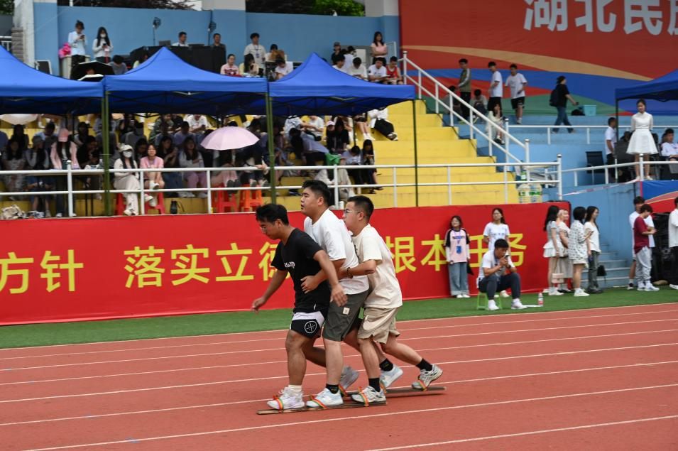 板鞋竞速的赛场上,运动员们步调一致、行走灵活、协调自然。板鞋拍打跑道的声音有节奏地响起,展现了青春的友谊与勇气。