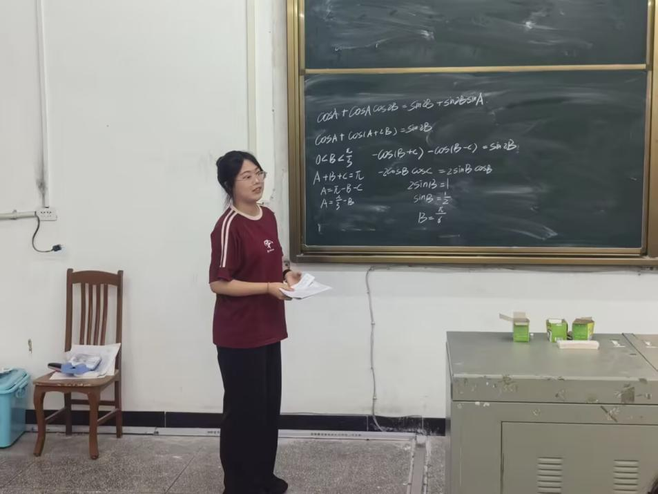 决赛于6月6日晚在3308教室举行,采用“即兴小课堂”形式展开。选手现场抽取数学题目,进行短暂思考后,以讲解结合板书的方式完成10分钟教学展示。本次比赛邀请学院田园老师、连丹青老师和优秀师范生代表闵小玉担任评委,从板书规范、讲解逻辑、语言表达、教学方法等维度打分。