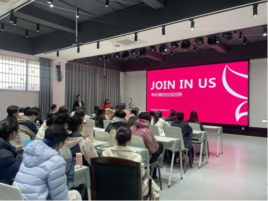 招聘会上,成人中国舞教研负责人郁安琪通过播放视频、PPT展示等向同学们详细介绍了公司品牌概况、企业文化、职位行业前景和招聘标准等。单色舞蹈创立于2005年,专注职业舞蹈教育培训,旗下设有几十家直营连锁培训场馆,培训项目涵盖中国舞、爵士舞、拉丁舞、东方舞、瑜伽等。会后,企业招聘负责人在学院7404舞蹈房开展了现场面试,舞蹈学部分学子进行了专业技能展示,据悉,武汉单色晓亮文化传播有限公司招聘岗位12个,此次面试舞蹈学专业20余名学生通过初试,下一步,将着手开展复试。