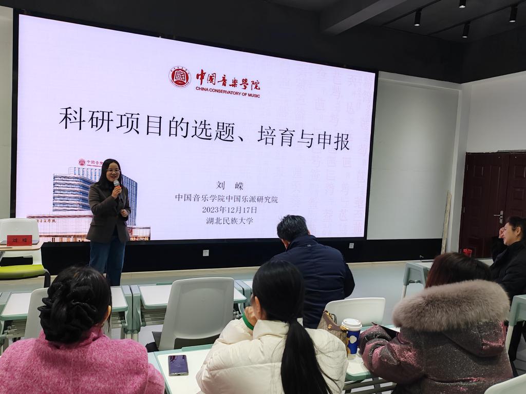 2023年12月18日,我院特邀中国音乐学院中国乐派研究院院长、中国音乐研究基地常务副主任、中国少数民族音乐学会副秘书长刘嵘教授,为全院教师作了一场题为“科研项目的选题、培育与申报”的学术讲座。