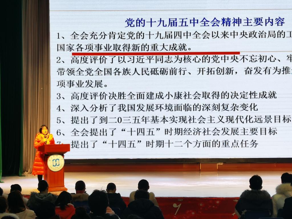 下午13时20分,马克思主义学院副教授蔡诗敏作题为“习近平总书记以人民为中心的思想在党的十九届五中全会精神中的贯彻和升华”专题讲座。蔡老师从四个方面分别阐述了我国进入新发展阶段的重大意义、有利条件和重要特征,重点强调要深化学习宣传贯彻习近平“坚持以人民为中心”思想的重大意义,深化其思想内涵的准确认知,践行于实际工作,贯穿立德树人全过程。