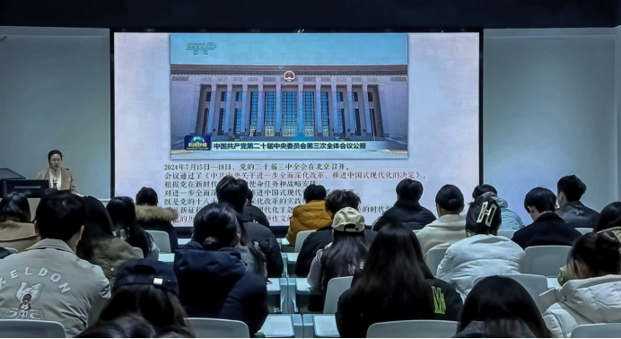 11月29日,音乐舞蹈学院党总支副书记邓丽同志,在学院演播厅为音乐舞蹈学院入党积极分子、团学干部代表以“凝聚改革共识 激发奋进力量——学习领会党的二十届三中全会精神”为题,讲了一堂生动的主题党课。课上邓书记给同学们梳理了党的二十届三中全会召开的概况,组织同学们重点学习了《中共中央关于进一步全面深化改革 推进中国式现代化的决定》(进一步全面深化改革的重大意义和总体要求);结合结合新时代大学生成长成才重点阐述了作为新时代大学生如何正确认识支持党中央的决策部署,以及作为新时代大学生如何将个人成长融入国家发展等问题。现场的同学们哥哥聚精会神,收获满满。