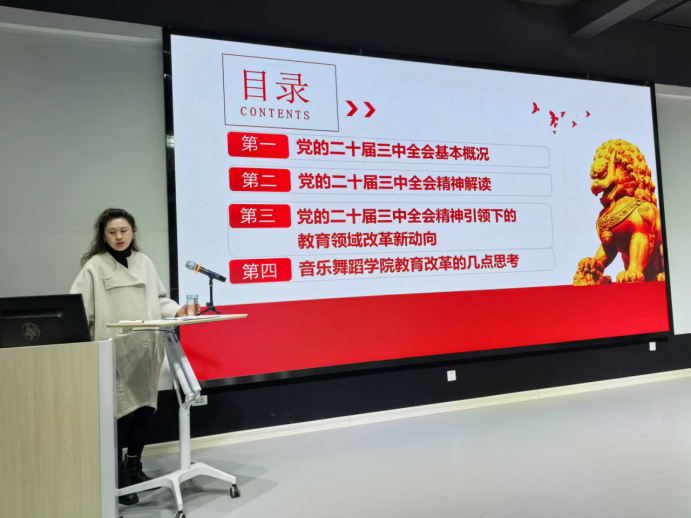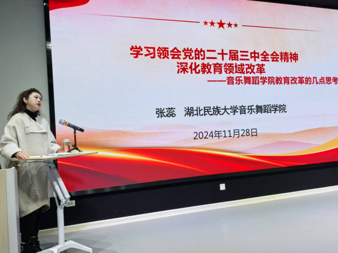 11月28日16:00,音乐舞蹈学院党总支书记张蕊同志为音乐舞蹈学院全体教职工,进行题为“学习领会党的二十届三中全会精神,深化教育领域改革——音乐舞蹈学院教育改革的几点思考”的专题辅导,张书记从分别从党的二十届三中全会基本概况、党的二十届三中全会精神解读、党的二十届三中全会应零下的教育改革新动向、音乐舞蹈学院教育专业教育改革的几点思考四个方面,充分结合音乐舞蹈学院实际,详细阐述了音乐舞蹈学院高质量发展过程遇到的问题、存在的短板以及相关建议,有高度,有深度、有温度,老师们受益匪浅。