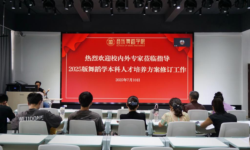 论证会由学院副院长王松主持。会议特邀多位国内舞蹈教育领域知名专家进行线上指导,包括北京舞蹈学院副院长邓佑玲教授、中央民族大学舞蹈学院院长姜铁红教授、湖南师范大学音乐学院王光辉教授以及华中师范大学音乐学院舞蹈系党支部书记兰天文副教授等。同时,学院舞蹈学专业全体教师及部分优秀毕业生代表杨覃、侯、熊辉、张含等在学院智慧教室现场参会,共同为人才培养方案把脉问诊。