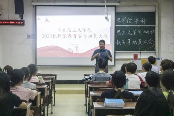 教育实习是师范生培养的重要组成部分,为确保2020级教育实习工作的顺利开展,9月10日18:00,我院在德智楼9B108教室举行2023年秋师范教育实习动员大会。我院院长徐铜柱,思想政治教育系主任邱世兵受邀出席。我院全体2020级学生参与此次活动。本次活动由教学科科长兰洁主持。