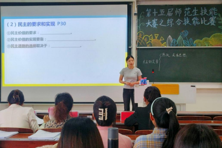 模拟授课过程中11号选手黄琳淋以哈哈创始人宗庆后的个人事迹为切入点,展开《公民的基本权利》的讲述。她用宗庆后创业维护自身权利的故事,引出公民的政治权利、人身自由权力和社会经济与文化教育权利等知识演讲环节,65号选手闫俊围绕《我最喜欢的动物》展开演讲,演讲内容层层推进,富有节奏感。