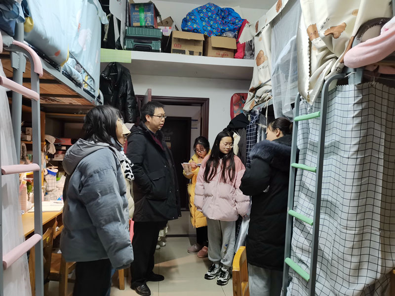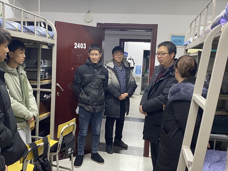 本网讯(通讯员 田金爽 见习通讯员 成楠/文 钟静双 刘锦栋/图)12月27日晚,我院党总支副书记张明波、学生科科长杨婷、辅导员毛召走访学生宿舍,开展安全隐患排查工作,关心我院学生的返家情况。