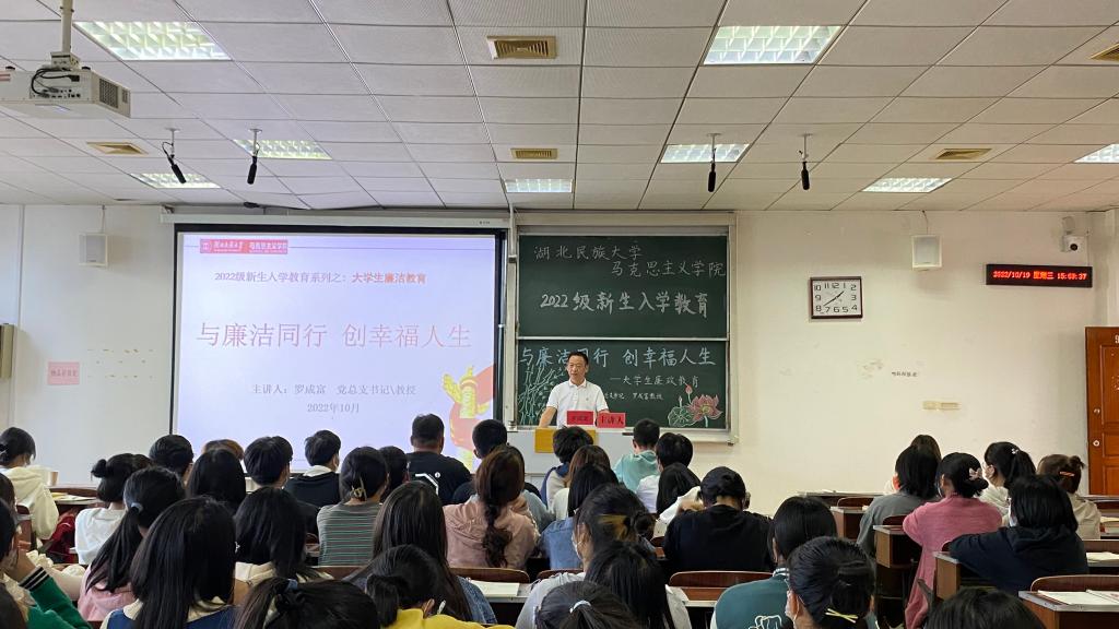 10月19日下午,我院于德智楼9B210教室开展2022级新生入学教育之大学生廉洁主题教育。我院党总支书记罗成富受邀出席并担任主讲人,团总支书记毛召及全体大一学生参与本次活动。