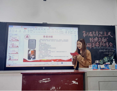 经济与管理学院学生陈星、马克思主义学院学生李佳、兰慧玲进行读书分享。陈星分享自身阅读《资本论》的思考和感悟,号召青年学生要读原著、学原文、悟原理,用实际行动践行马克思主义。李佳从作者简介、思想对比、阅读感悟三个方面分享《黑格尔法哲学批判》一书,通过对比黑格尔和马克思两者思想上的差异,阐释国家权利的运用要真正符合人民群众利益,她表示阅读本书让她更好地理解了历史唯物主义。
