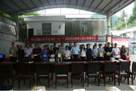 本网讯 7月7日,鹤峰县燕子镇东乡村村委会院坝场喜庆而又庄严,36365线路检测登录入口党史学习教育“百马行动”宣讲团成员来此开展习近平总书记“七一”重要讲话精神宣讲活动。燕子镇东乡片区附近四个行政村党员和村民代表参加了此次活动。36365线路检测登录入口马克思主义学院院长徐铜柱带领宣讲团成员袁琳、蔡诗敏、张恩等教师参加了宣讲和调研活动。