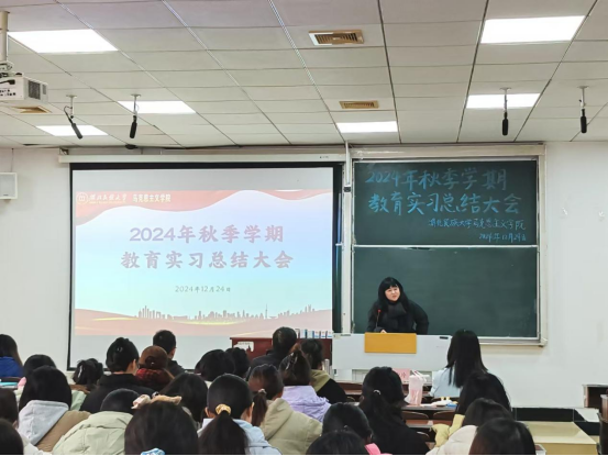 12月24日下午,我院在德智楼9B210教室召开2024年秋季学期教育实习总结大会。我院副院长张胥,思想政治教育系主任梁舒,实习带队老师张少玲参与此次会议。会议由教学科科长兰洁主持,大三、大四全体学生参加此次大会。