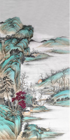 作品简介:《峡韵图》是以大峡谷为原型,通过主观的处理,用青绿色彩来体现恩施的美丽山川。采用竖构图的形式表现峡谷风韵,增加空间的纵深感,画面内容布局主要集中在画面的左半边,右边再增加一些平矮的山丘相呼应,达到左右平衡,通过左右的山石排列,将中间的河流形成S字形,增加了画面的延伸感、透气性。