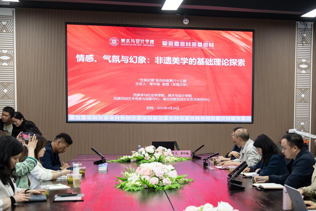2025 年 4 月 24 日晚,民族学与社会学学院与我院共同邀请东南大学中华民族视觉形象研究基地专家、博士生导师季中扬教授,在12B501多功能教室举办“情感、气氛与幻象:非遗美学的基础理论探索”为主题的讲座,民族学与社会学学院与我院研究生、部分教师和本科生参与讲座和讨论。讲座由我院院长石庆秘教授主持。