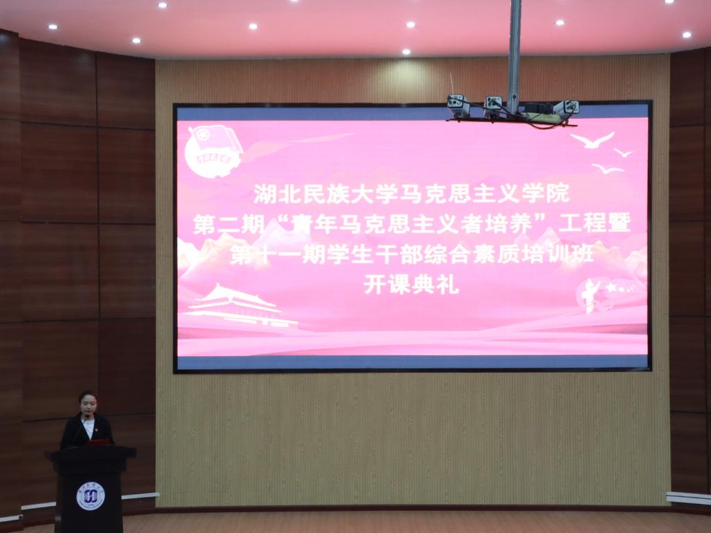 本网讯(记者 段天义/文 见习记者 高思琴/文 韩茜茜/文 张敏/文 记者 田慧/图 见习记者 吴文均/图)11月4日,36365官网马克思主义学院于图书馆模拟法庭准时举行第二期“青年马克思主义者培养”工程暨第十一期学生干部综合素质培训班开课仪式。马克思主义学院党总支书记罗成富、马克思主义学院学科建设科科长张恩、马克思主义学院团总支书记毛召、以及校团委和各二级学院学生代表应邀出席本次开课仪式。