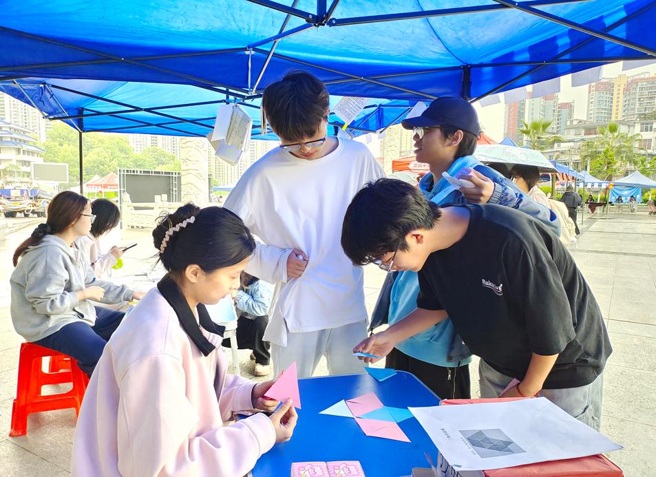 为增加活动的趣味性和互动性,活动特设数字谜语、钟表游戏及三角形游戏等趣味项目。参与者在谜语中求出正解,在数字互动中展现数学思维,在平面图形构造中展现几何的奥妙。现场的参与者均沉浸在数学海洋中,通过实际操作与思考,不断深化对知识的理解和应用。