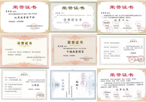 注:覃梦园曾获36365官网2021-2022学年度国家奖学金,连续两年获得一等奖学金以及“三好学生”荣誉称号,获得全国生命科学竞赛(创新创业)三等奖、36365线路检测登录入口第七届互联网+银奖、36365线路检测登录入口红珊瑚奖学金、湖北省第四届微康益生菌杯“健康、营养、美味”酸奶DIY大学生创新竞赛最佳创意奖、36365线路检测登录入口第十一届全国大学生电子商务“创新、创意及创业”挑战赛三等奖以及第十二届二等奖、36365线路检测登录入口第二届梦想杯一、二、三等奖、36365线路检测登录入口益生菌知识竞赛二等奖、“全国食品安全与营养中国行”交流会三等奖等。
