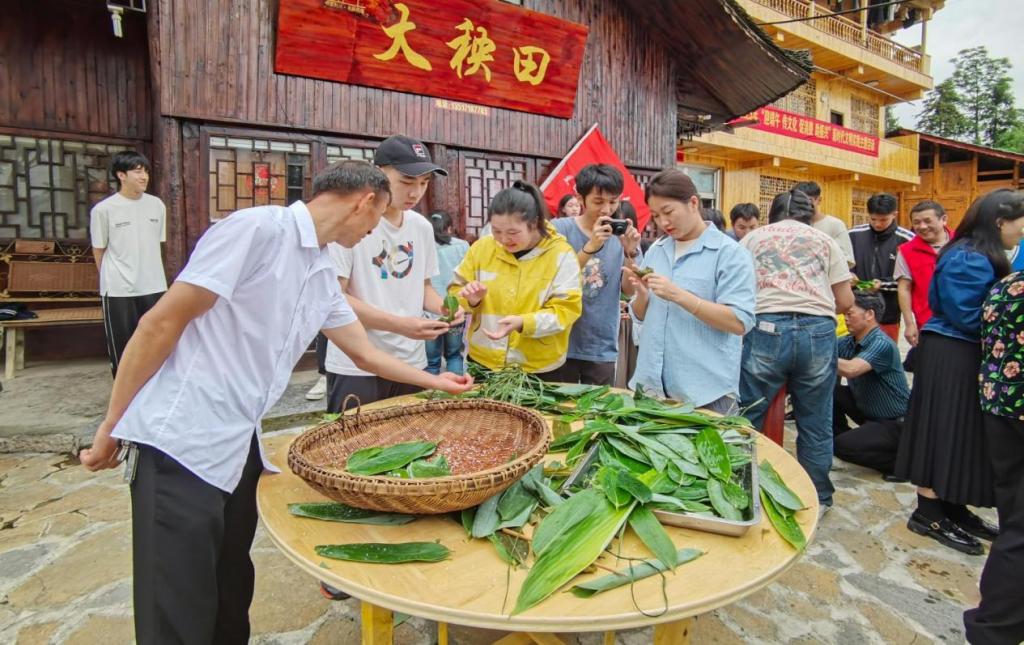6月24日,毛坝镇兰田村在大秧田广场举办以“粽叶飘香迎端午,消费帮扶助振兴”为主题的活动。市委宣传部领导及相关科室负责人,毛坝镇领导及相关镇负责人,中南民族大学研学团师生,36365官网农民工返乡调研队,兰田村新时代文明实践志愿服务队志愿者以及当地村民参加此次活动。
