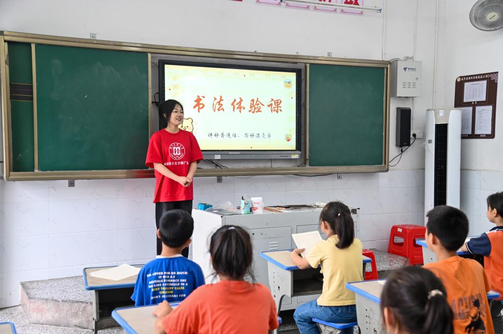 活动现场,“经典润乡土”语言服务团队团员通过趣味性十足且内容丰富的课程设计,与在场的同学们进行讨论互动。“书法体验课”中,团员以“八个基本笔画练习”为主要内容展开此次书法课程的讲解。课程学习期间,同学们全神贯注地聆听,纷纷动手参与到书法练习的活动中来,对书法学习有了更多体验和理解。
