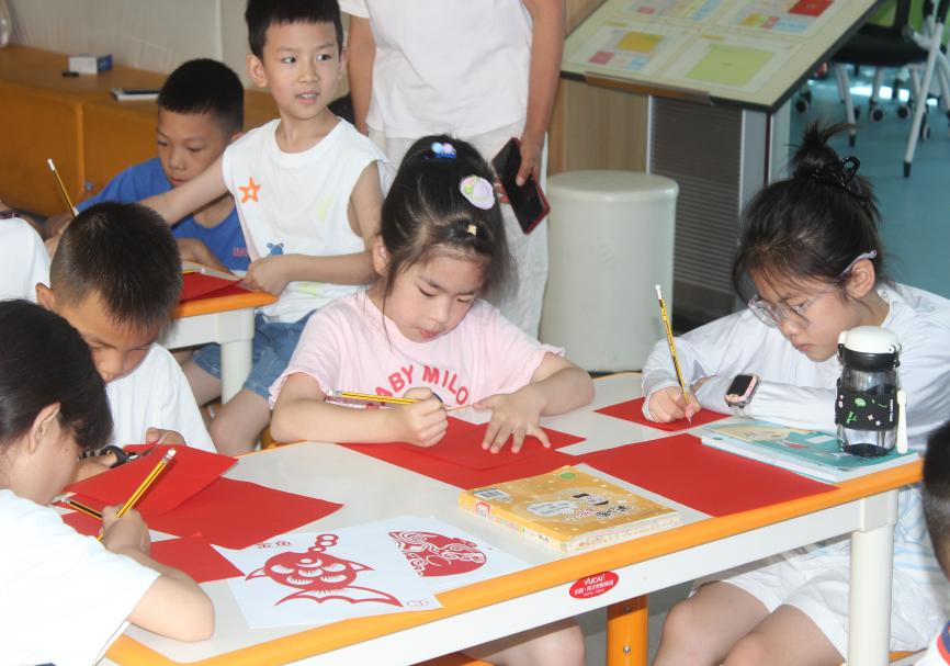 在艺术实践环节,漆扇制作和剪纸教学有序开展。团队成员耐心地教孩子们如何调色制扇,孩子们充分发挥想象,制作出各具特色的漆扇作品。