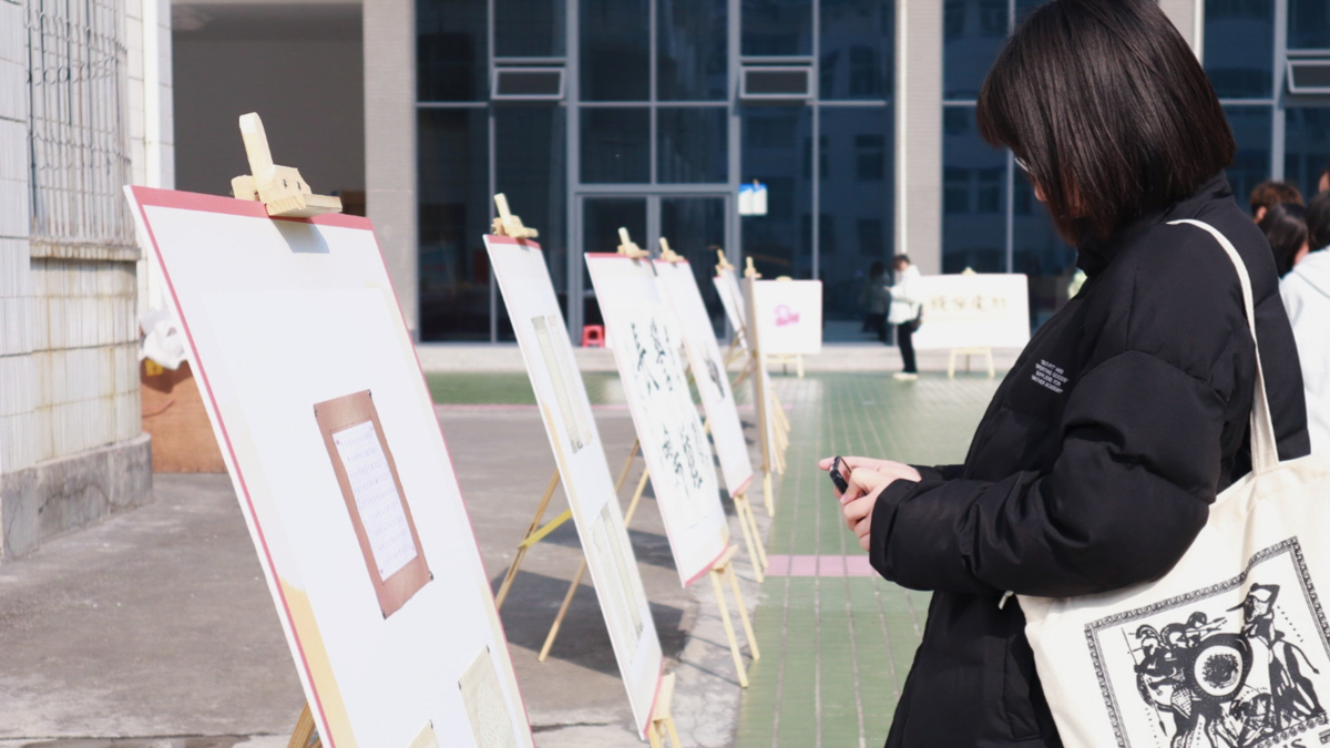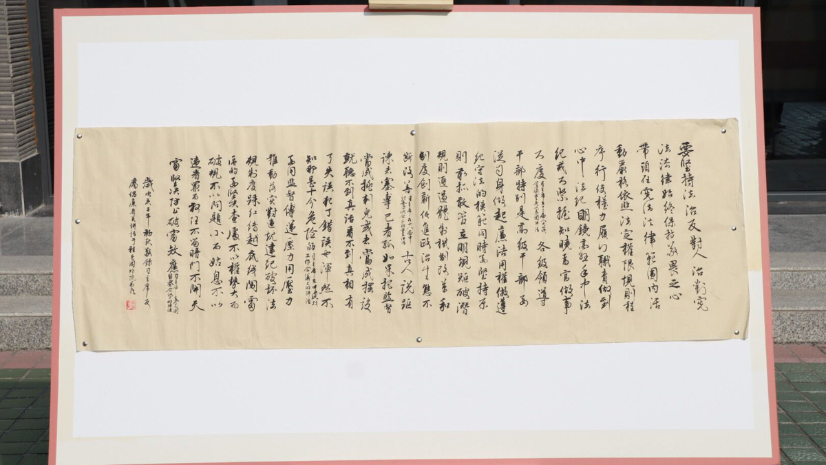 本次书画展现场展出楷书、行书在内的书法作品及工笔画、水墨画等在内的绘画作品共计56幅。种类繁多、各具特色,吸引了众多师生驻足观看。其中,法学院夏万婧的一篇《千字文》结体端庄,师古而不泥,一笔一划写出风清气正;美术与设计学院李佳蔓的作品《廉》,以细致的笔墨勾勒草鞋的朴素,意在劝诫众人以朴为质,以洁当先。