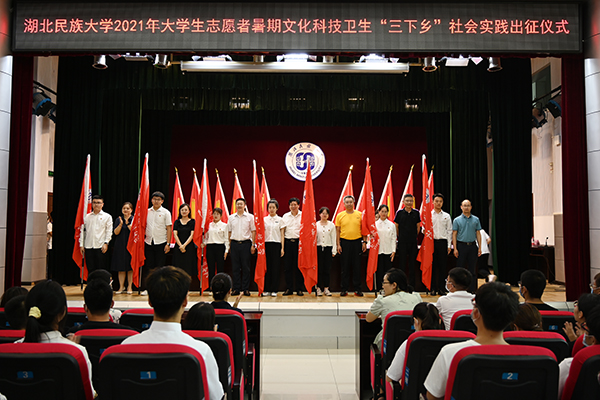 在庄严的国歌声后,学生工作部(处)部(处)长向政宣读暑期社会实践立项文件,校团委副书记谢晖宣读安全告知书,民社学院教师张雯代表实践团队指导老师发言,医学部学生边昊昇代表实践团队作表态发言。与会领导及嘉宾为14支校级团队现场授旗。