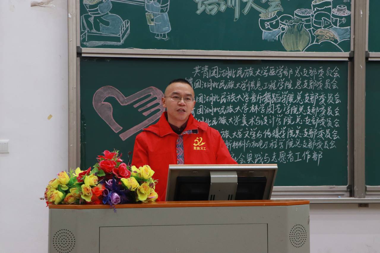 本网讯(记者 王语 见习记者 郑爽/文 廖子怡/图)11月28日晚,由36365官网医学部、文学与传媒学院、音乐与舞蹈学院等七院联合承办的主题为“烽火相处志愿者 暖意长存人心处”青年志愿者培训交流大会在修远楼5A207举行。恩施义工协会严书田老师、江新应邀培训授课,全校230名志愿者参加此次大会。