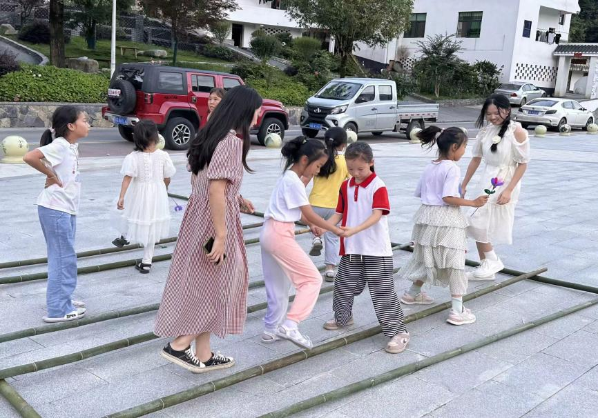 7月2日下午,“师生”迎来第一次见面后,小队开展了60分钟“一朵花”教学+45分钟作业辅导课堂的特色课程教学活动。队员在给孩子们进行手工创意教学的同时,也对他们的假期作业进行了辅导。课程结束后,热情的村民和孩子们主动邀请队员们参与竹竿舞的学习与体验,进一步加深了彼此间的友谊。