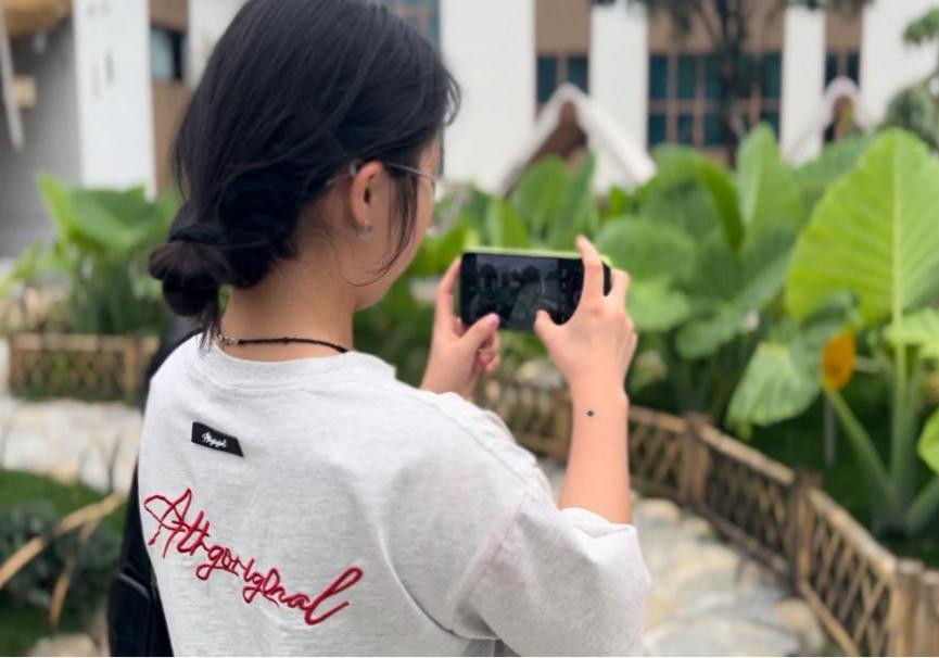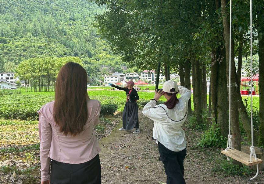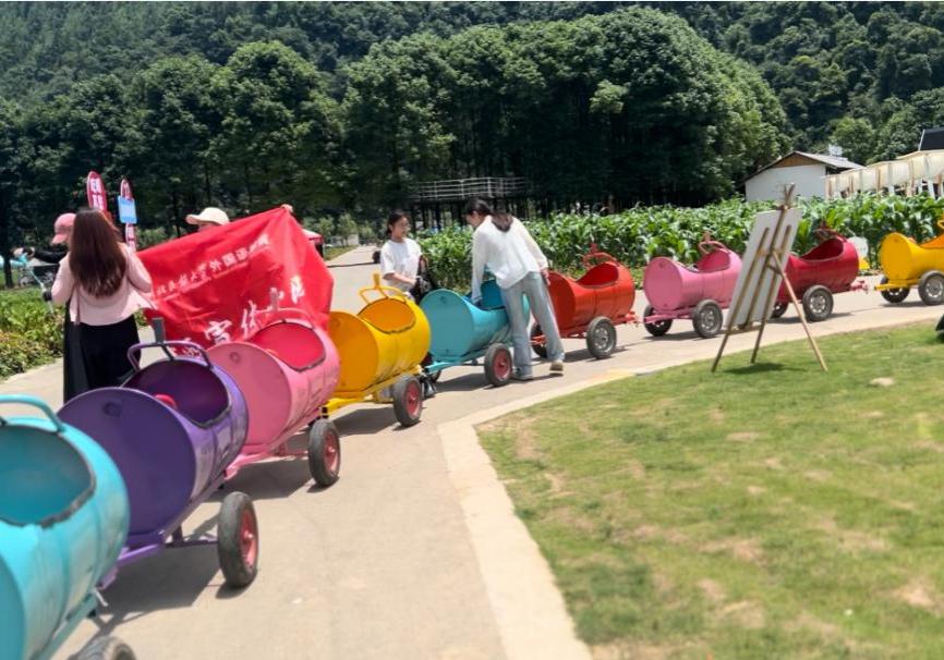 团队成员首先来到巨型“毛毛虫” 桥进行拍摄,并亲自体验了秋千和七彩小火车。颜色艳丽的小火车与阳光交相呼应,形成了一道靓丽的风景线,团队成员全身心投入拍摄过程之中,与在此游玩的游客交谈并了解到了塘里堂外的特色乡野文化。微风吹散了酷暑的燥热,无论是团队成员还是游客本来浮躁的心情在看到塘里堂外景色的那刻都趋于平静。