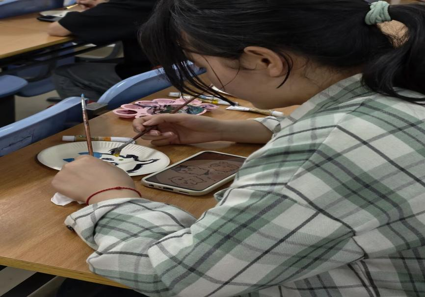 活动现场,参与者专注而投入。他们有的手握画笔,时而轻蘸彩墨,精心勾勒花鸟轮廓;有的大胆调色,铺陈山水意境;还有的相互交流灵感,以点线面结合的方式,将生活感悟与奇思妙想倾注于纸盘之上,尽情展现美术创作的魅力。在这一过程中,参与者不仅拓展了思维,感受到美术独特的魅力,还丰富了自己对校园生活的想象,为课余生活增添了绚丽色彩。