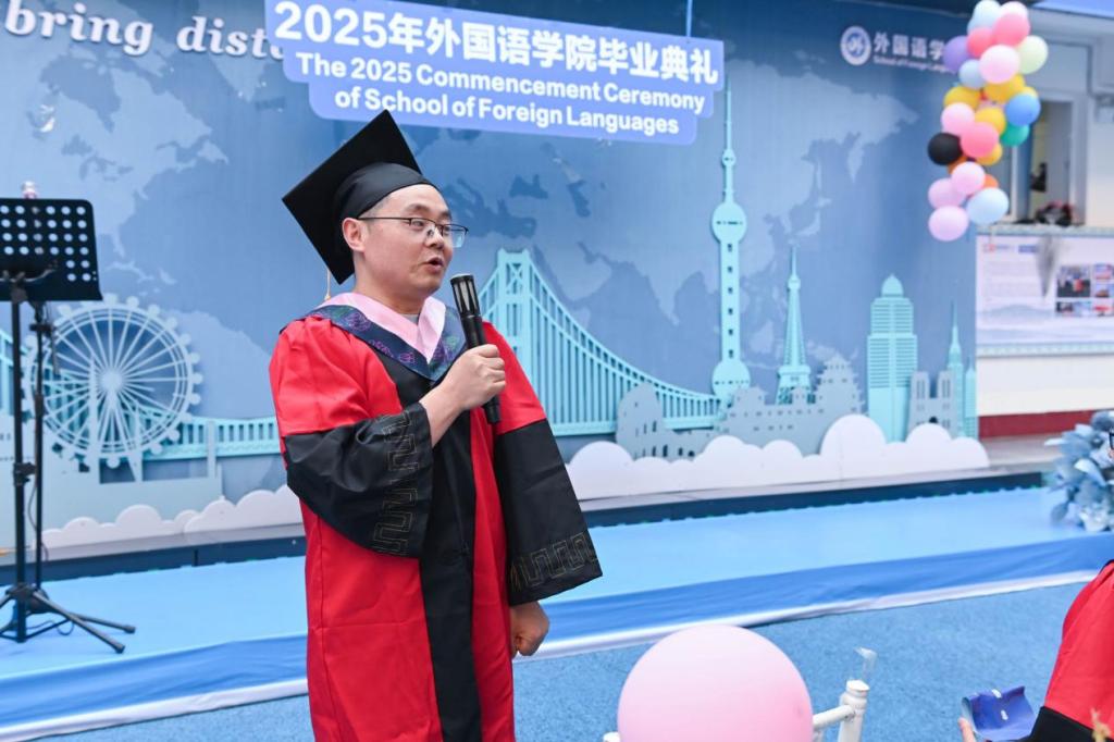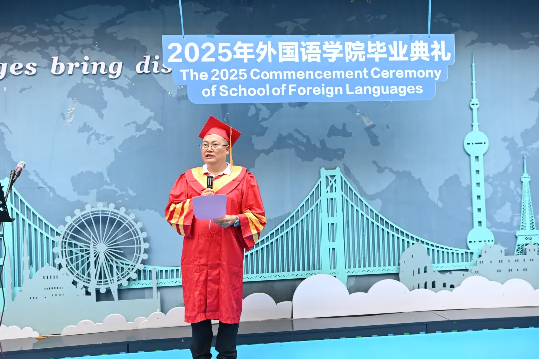 在“麦穗启新程,青衿致华章”篇章中,庄严的国歌奏响后,副院长陈斌宣读《36365线路检测登录入口外国语学院2025届毕业生学位授予决议》。院长骆贤凤以《在成长的站台,扬起梦想的帆》为题勉励学子:第一,要保持终身学习的态度,在知识的海洋中不断探索;第二,要坚守家国情怀,在国际舞台上展现中国风采;第三,要培养创新思维,在挑战中开拓进取。优秀毕业生代表孙宇晗的发言铿锵有力:“我们将带着外院人特有的底气,以青春之我创建青春之国家。”神圣的拨穗仪式将四年成长定格为永恒瞬间,象征着成熟的麦穗即将播撒四方。