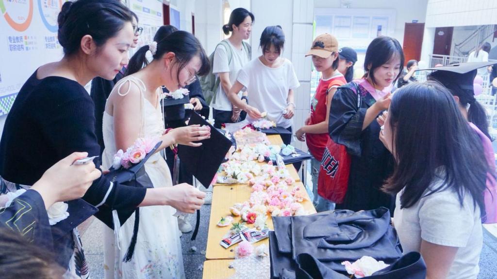 典礼之前,学院精心策划的“学士帽簪花”和“隔空对话”活动率先点燃毕业季氛围。毕业生们以巧手装点学士帽,将鲜花与创意融入传统毕业服饰。一簇簇绽放的簪花,既是对校园时光的深情告白,更是奔赴未来的浪漫宣言。在“时空信箱”环节,毕业生们执笔写下给2025级新生的寄语卡片,或分享求学心得,或传递成长智慧,完成了一场跨越时空的青春对话。