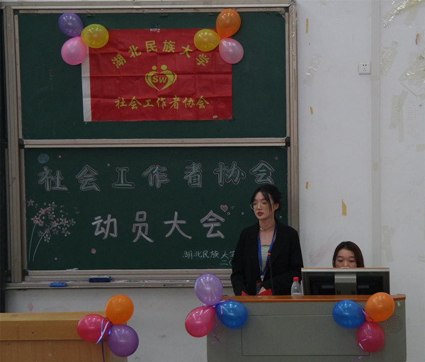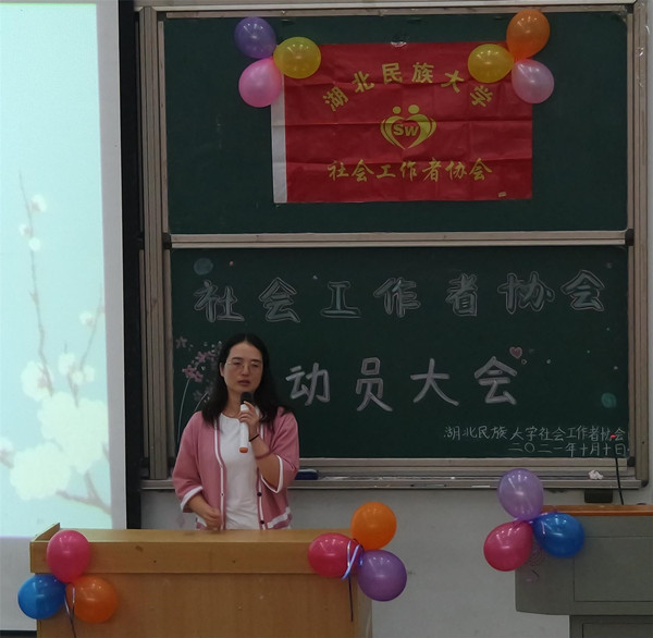 本网讯(记者 欧阳洁/文 刘睿/图)为帮助新会员全方位了解社会工作者协会,10月10日下午,我院社会工作者协会在修远楼5B404学术报告厅举办第十二届社会工作者协会动员大会,我院团总支书记熊霞,团总支副书记姚萍、刘圣富,学生会主席柯欢,社会工作者协会社长罗周婕受邀出席本次大会,各兄弟社团代表与全体会员到场参与此次活动。