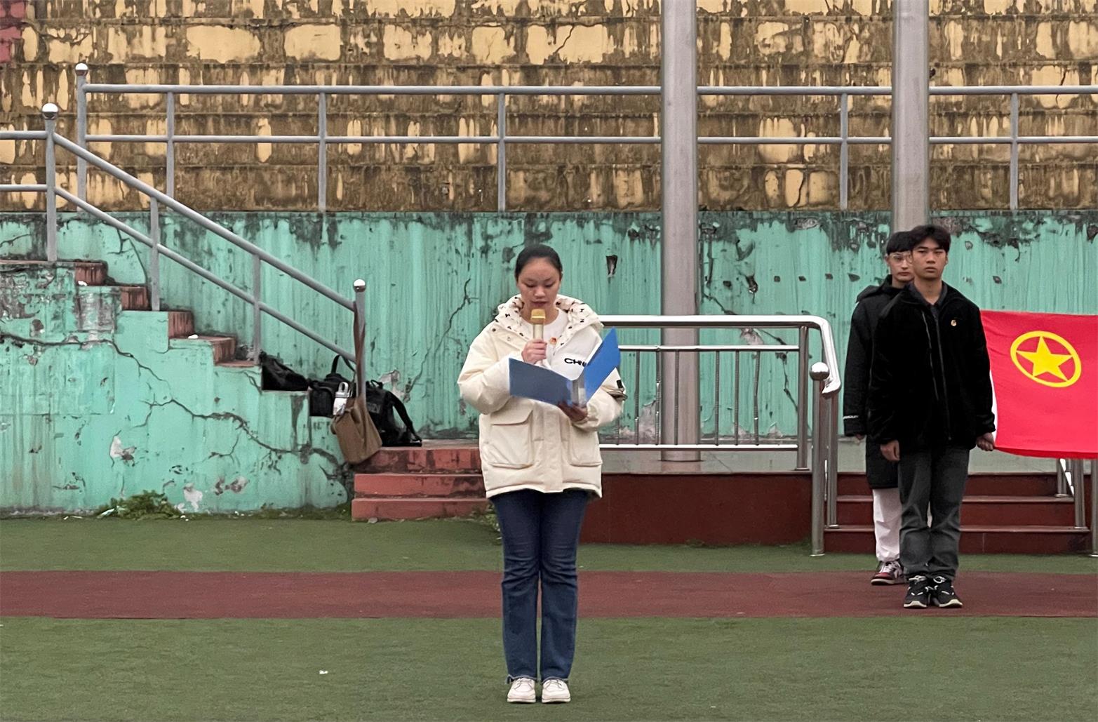 活动伊始,美术与设计学院团总支书记彭阳上台致辞,他强调青年大学生应做磨而不磷的坚定者、朝乾夕惕的奋进者、傲雪冰霜的搏击者,肩负时代责任,做“有理想、有道德、有文化、有纪律”的青年。随后,进入“升国旗、奏国歌”环节,到场人员肃立致敬,目送国旗冉冉升起并齐唱国歌。在接下来进行的“出团旗、奏团歌、重温入团誓词”环节中,我院优秀团员代表李慧带领全体人员一同宣誓,重温入团誓词,并由美术与设计学院优秀团员代表王佳艺和顾斯坦为在场成员带来微团课朗诵。紧接着,我院优秀团员代表程琪进行时事汇报工作,她呼吁青年须积极承担历史使命,投身为实现中华民族伟大复兴的中国梦的实践中去。