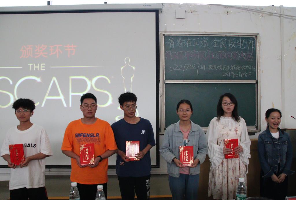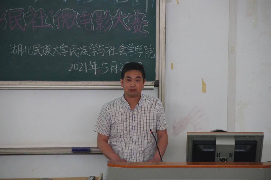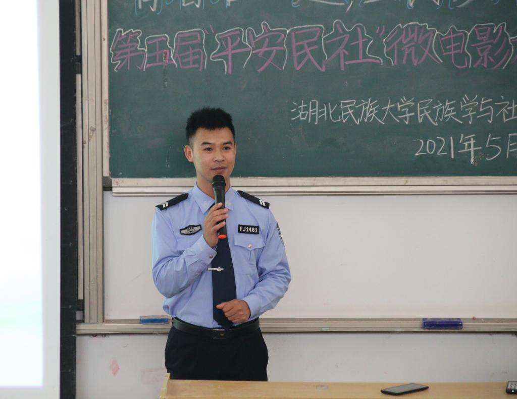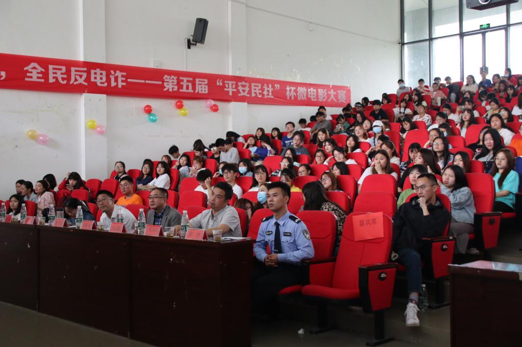 本网讯(记者 李金茜 张瑶/文 刘睿 肖欣/图 )5月28日,民族学与社会学学院于修远楼5B404教室举办“青春在正道,全民反电诈”第五届“平安民社”杯微电影大赛,该院全体学生参与本次比赛。学校保卫处处长郭智斌,校团委书记方云霞,民族学与社会学学院党总支书记曹召胜,保卫处副处长何永红,学工处学生思想教育及管理科科长赵琴,土桥派出所民警王烁、辅警罗浩担任本次微电影大赛评委。