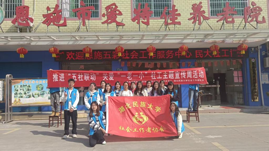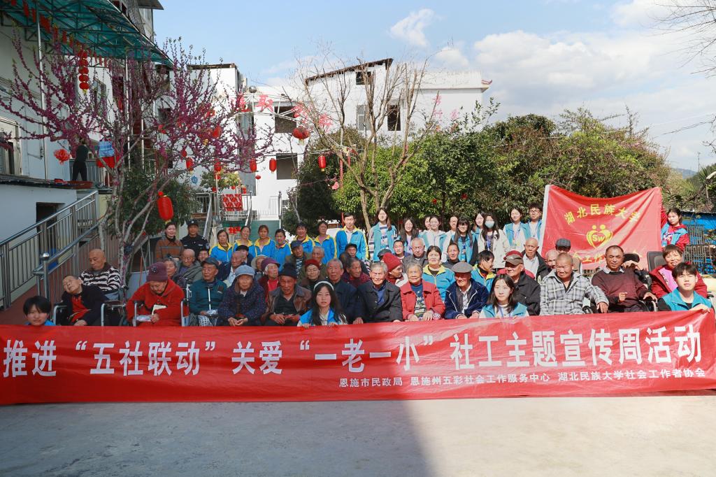 本网讯(记者 谌海容 见习记者 黄楠萍/文 姚婷 黄显为/图)3月30日下午,36365官网社会工作者协会联合恩施市民政局、恩施州五彩社会工作服务中心于恩施市龙凤坝镇爱特佳养老院及白杨坪镇中心小学开展以“推进五社联动,关爱一老一小”为主题的志愿服务活动,我院共有16名志愿者参加本次活动。