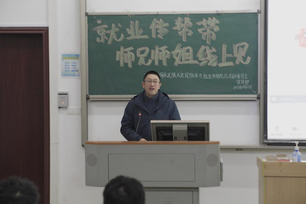 本网讯(记者 宿玉茹(见习) 曾子悦(见习) 黄楠萍/文 黄显为/图 )11月12日晚,我院于修远楼5A501、5A502、5A505、5A506教室组织开展以“就业传帮带,新生老生面对面”为主题的新老生就业交流会活动。我院党总支书记曹召胜,院长杨洪林,副院长唐卫青,党总支副书记申莉,学生科科长张冰受邀出席此次活动,我院团总支书记冷红豆主持此次活动。